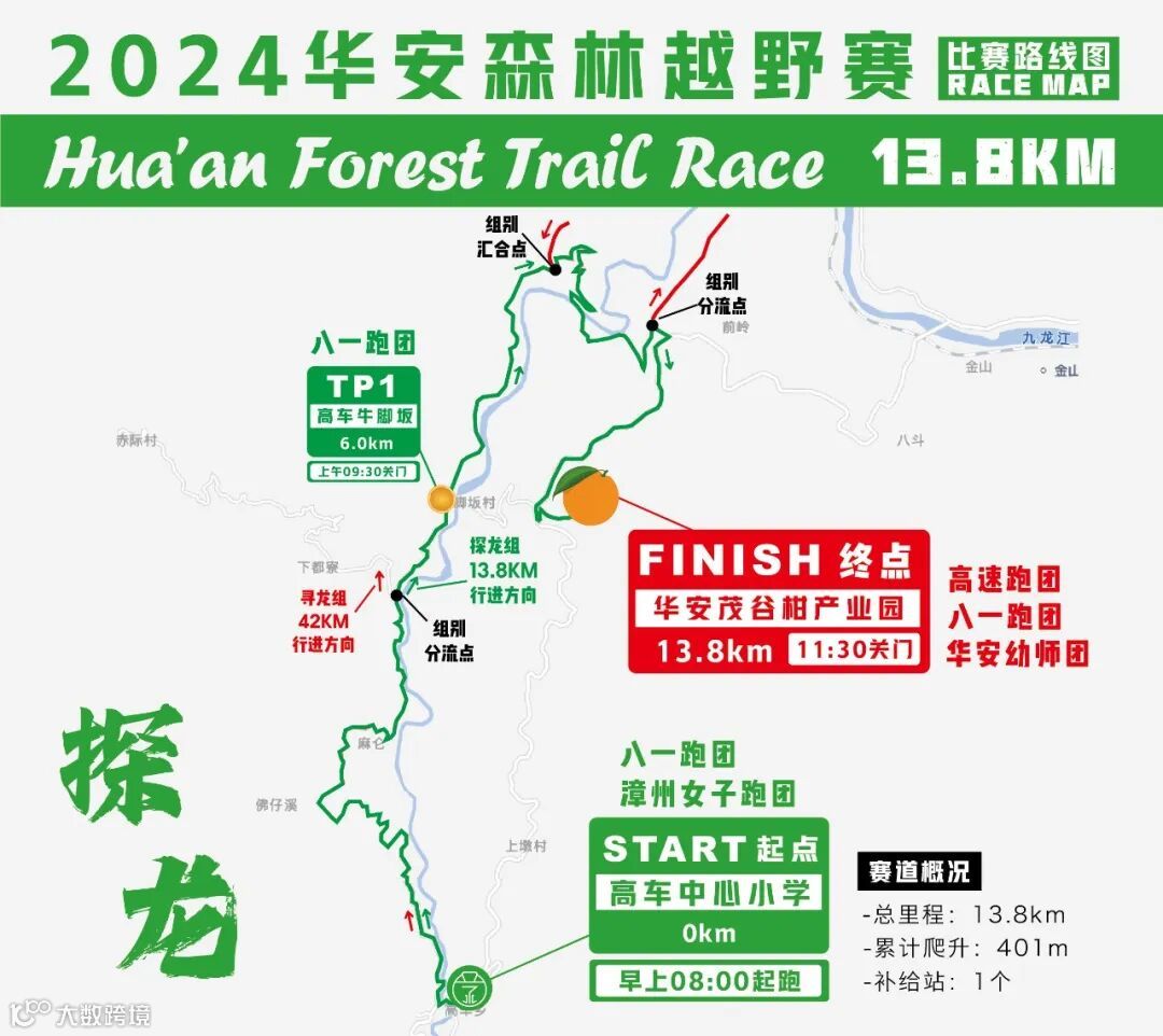 13.8km探龙组:在6km处提供水和运动饮料水果,终点处提供热食补给。