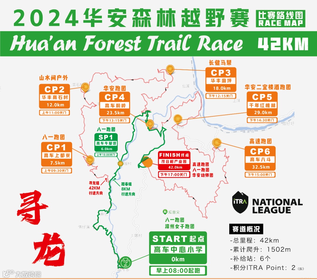(1)寻龙组42KM:高车乡中心小学(起点)—高车佛仔溪—高车上都寮—华丰高石村—华丰麻坪—高车前岭—千年红锥林—高车八斗—华安茂谷柑产业园(终点)