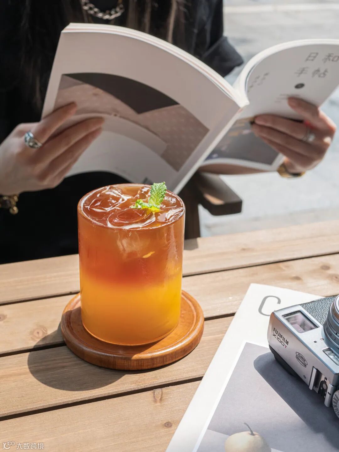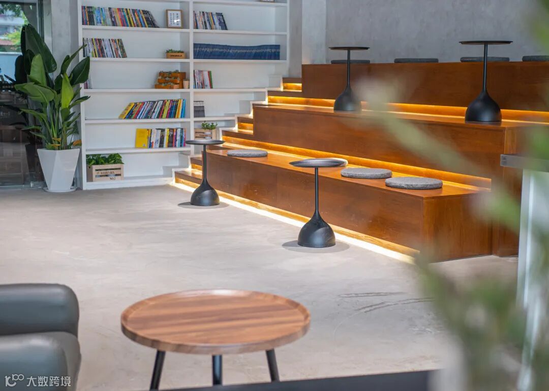 正好旁边有一处歇息地,店内贴心布置了不同类别的座位,皮质沙发、室外木质桌椅,还有贴着书墙的阶梯式座位。