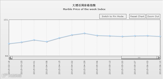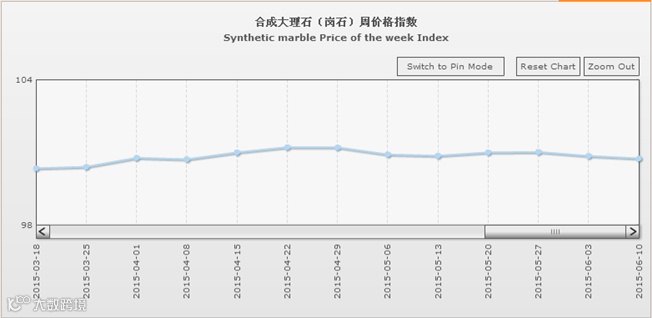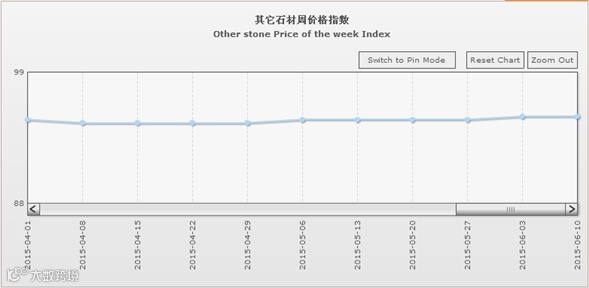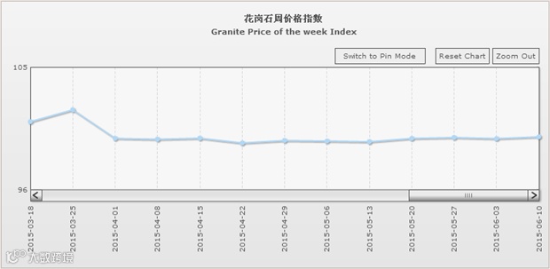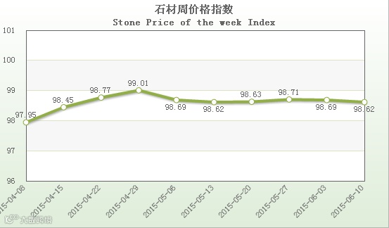 据“中国·水头石材指数”系统监测,20150610期石材周价格指数收报于98.62点,环比略下滑0.07点,下滑约0.07%。本周石材价格指数继续微幅下调,市场价格行情持续下滑,其中除了花岗石价格小幅逆势回升外,大理石、其他石材类、合成大理石类价格则均有所下调。本周少数库存石材品种继续降价清仓处理,部分品类因市场竞争加剧、需求继续回缩,价格持续小幅下调。