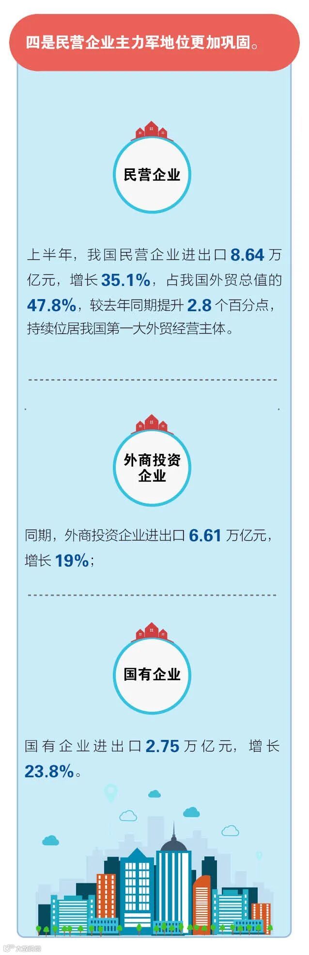 三是区域发展更趋协调。上半年,中西部地区民营企业进出口增速达44.6%,增速比民营企业整体增速高出了9.5个百分点。民营企业进出口增速前10位的省份中,有8个来自我国中西部地区。