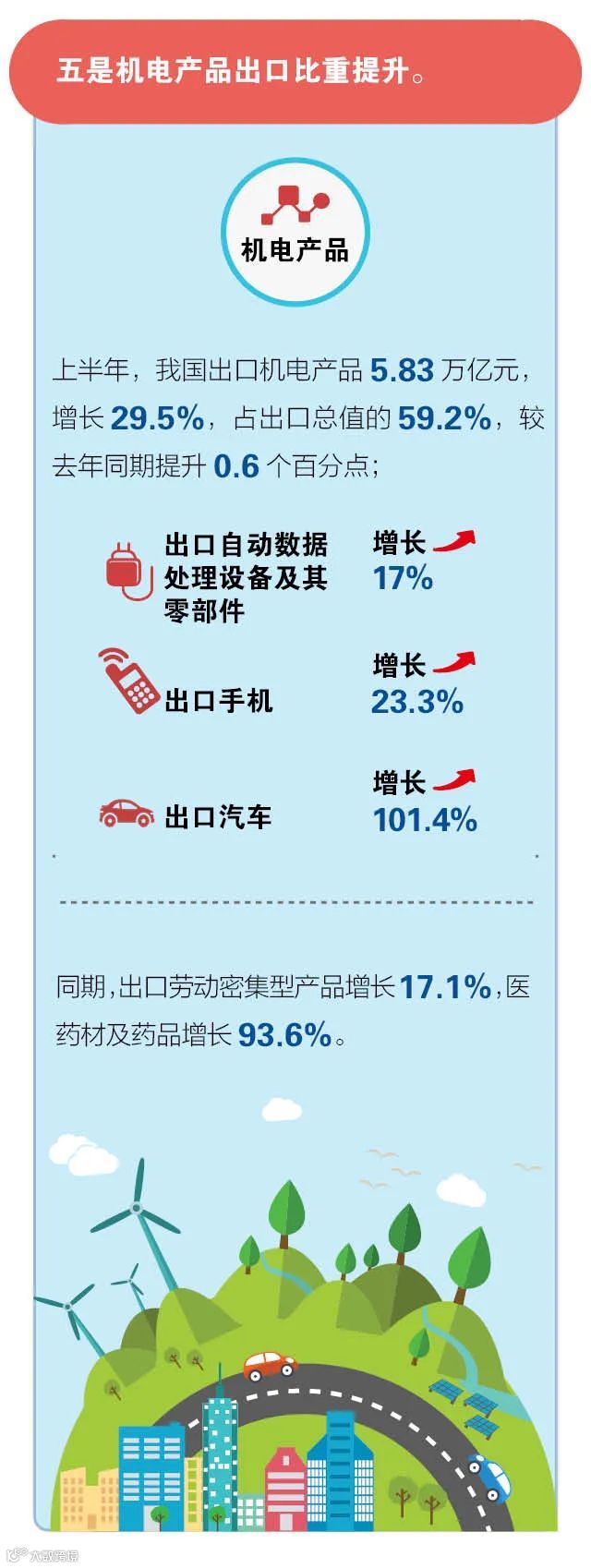 二是“宅经济”产品、钢材、汽车等出口表现亮眼,成为拉动我国对沿线国家出口增长的重要力量。上半年,我国对“一带一路”沿线国家出口电脑、家用电器、家具等“宅经济”产品合计1873亿元,增长35.1%;出口钢材1278.7亿元,增长47.8%;出口汽车及零部件1050.2亿元,增长54.6%;出口医药材及药品425.6亿元,增长95%。