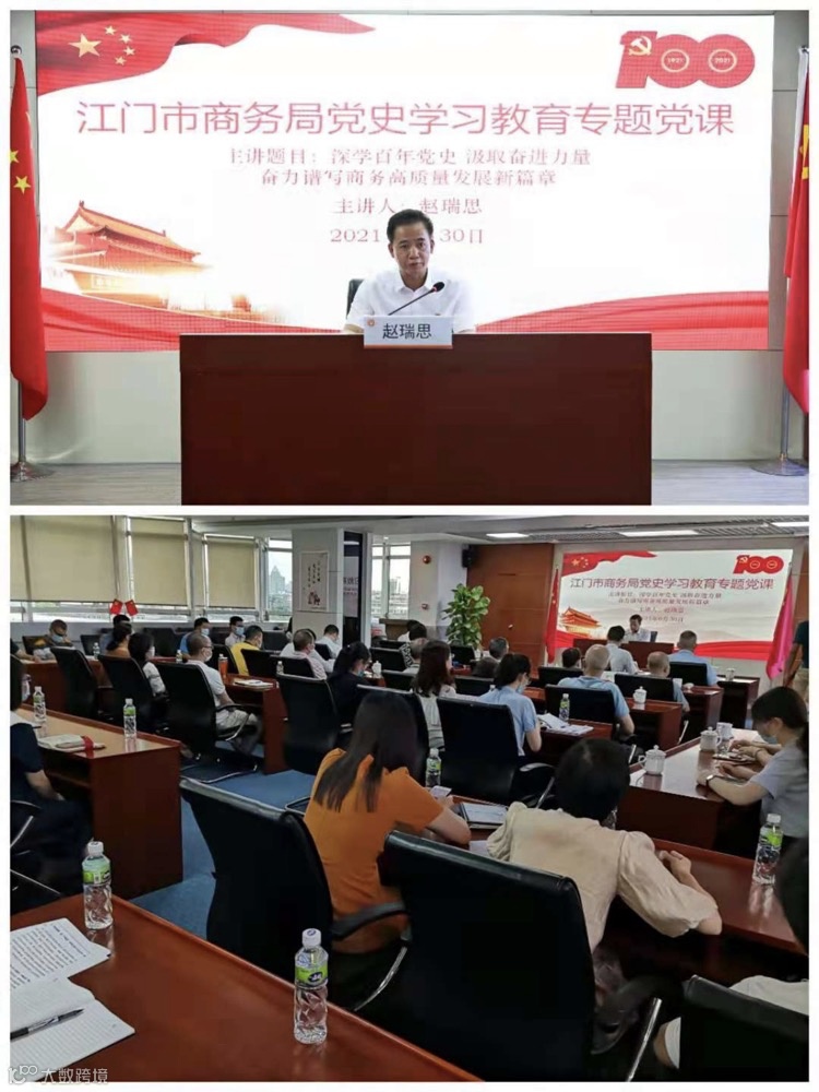 一百年光辉历程,五十载初心不改。6月30日,江门市商务局举行党史学习教育“书记讲党课”活动暨“光荣在党50年”纪念章颁发仪式。市商务局党组书记赵瑞思给全局党员、干部职工讲党课,并为老党员代表颁发“光荣在党50年”纪念章。市委党史学习教育第一巡回指导组李钜灿、苏捷同志,市商务局全体干部职工、离退休党支部党员代表和江门外商投资企业协会党支部全体党员参加了活动。