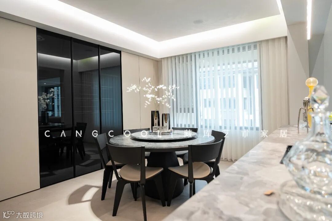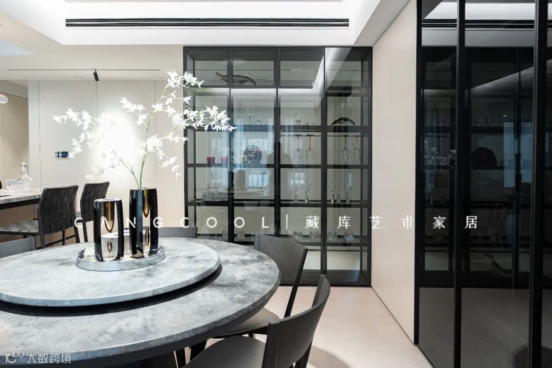 餐桌选择了简洁百搭的黑色,让整个空间更协调。用餐区恰好面向生活阳台,采光也非常好。餐厅与酒柜的衔接,让用餐的动线更加流畅。