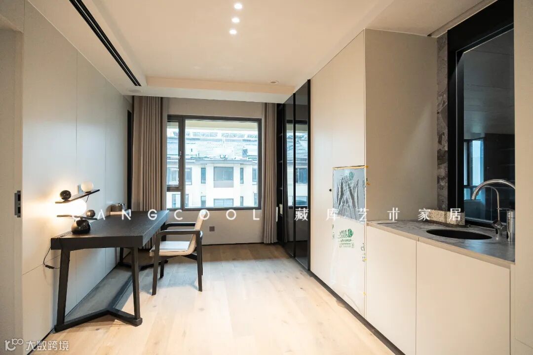 空间围合以线性元素贯穿其中,简致,流畅,搭配现代家具,干净素雅,结合大理石和布艺纹理,让空间背景兼顾美观舒适的同时,植入安静纯粹的精神观感。