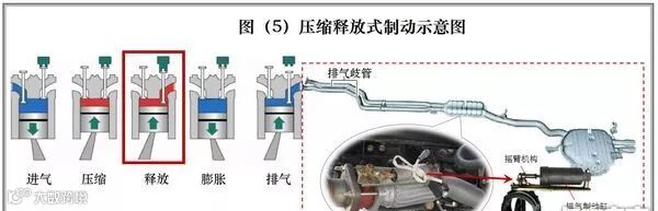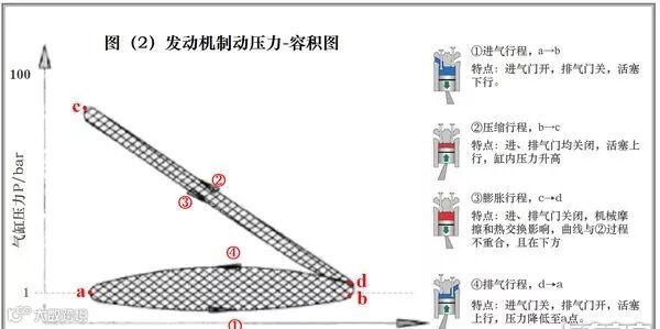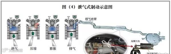 压缩行程中,压缩空气通过微小开启的排气门“泄出”,使缸内压力下降,减少膨胀过程中压缩气体对活塞做功,从而提高制动功率,详见图(4)。