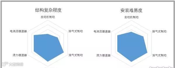 3、结构复杂程度:泄气式/压缩释放式制动涉及发动机结构改动,往往复杂程度较高,其次是液力/电涡流缓速器,发动机制动结构最简单。