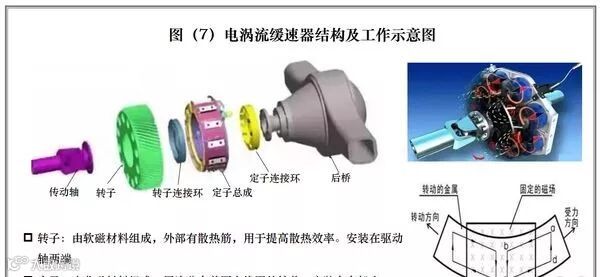 从名称上可以看出,电涡流缓速器的区别在于传递力的介质,液力缓速器是利用液体(液压油或水)传递力,而电涡流缓速器是利用磁场力。电涡流缓速器的主要结构详见图(7)。