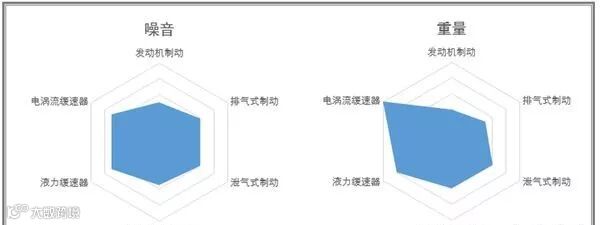 6、重量:电涡流缓速器,受电磁感应所需材料影响,重量最大,其次是液力缓速器。在制动功率相当情况下,液力缓速器明显比电涡流缓速器更适合目前追求轻量化的物流商用车市场需求。泄气式/压缩释放式制动器重量较小。