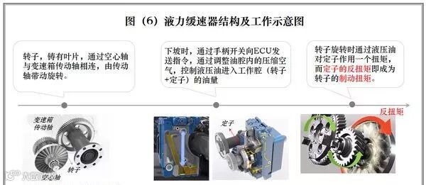 液力缓速器,主要通过反作用于变速箱传动轴扭矩,通过传动系传递至车轮,达到减速目的,具体工作原理,详见图(6)。