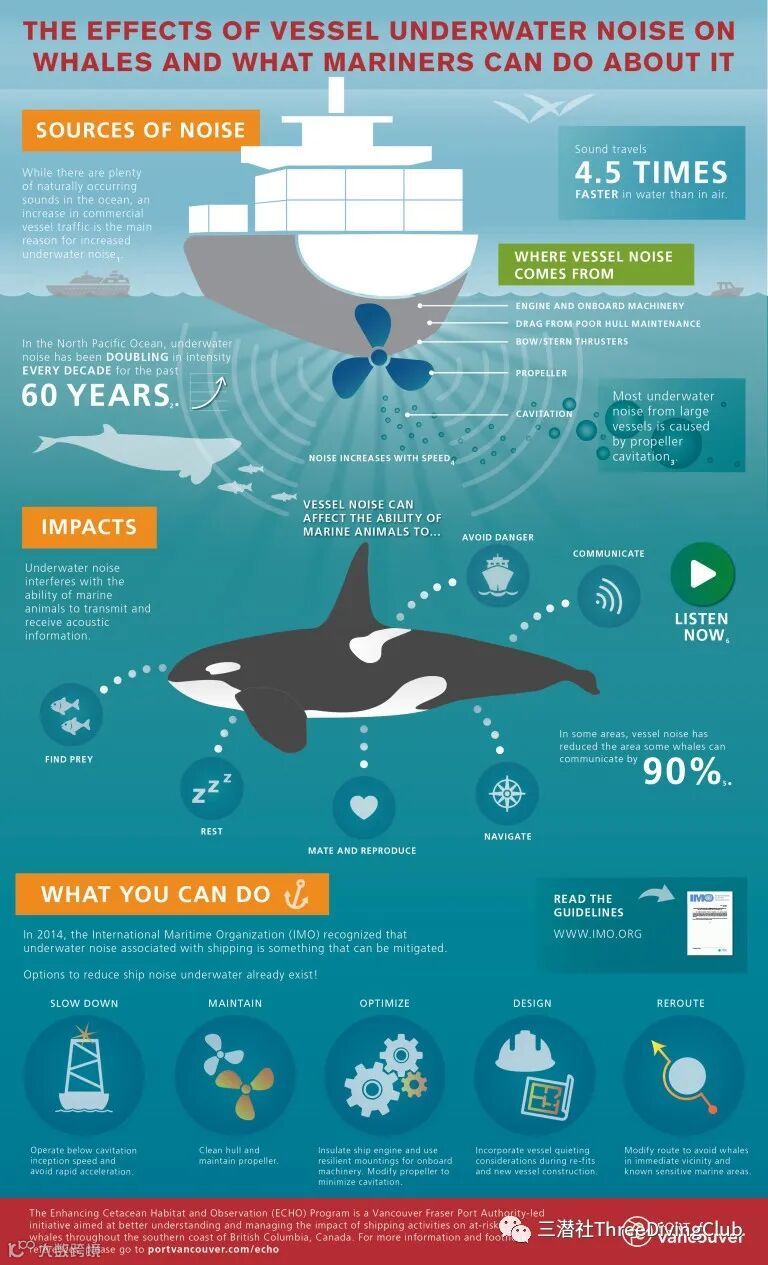 声音在水下是一种重要的感官刺激,它在水下的传播距离比在空气中要远得多。许多海洋物种——从鲸鱼到礁鱼的幼鱼和无脊椎动物——都依靠声音来导航、觅食和繁殖。人为噪音干扰这些活动,并对动物行为、听力和其他身体功能产生有害影响。但是,噪音并不会在海洋环境中持续存在——比如,有害的化学物质和微塑料。