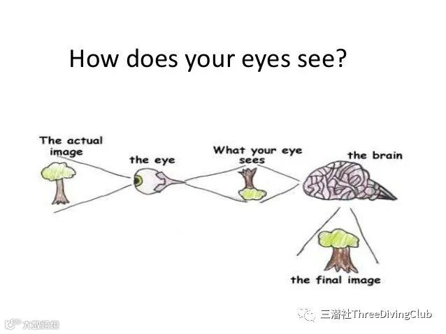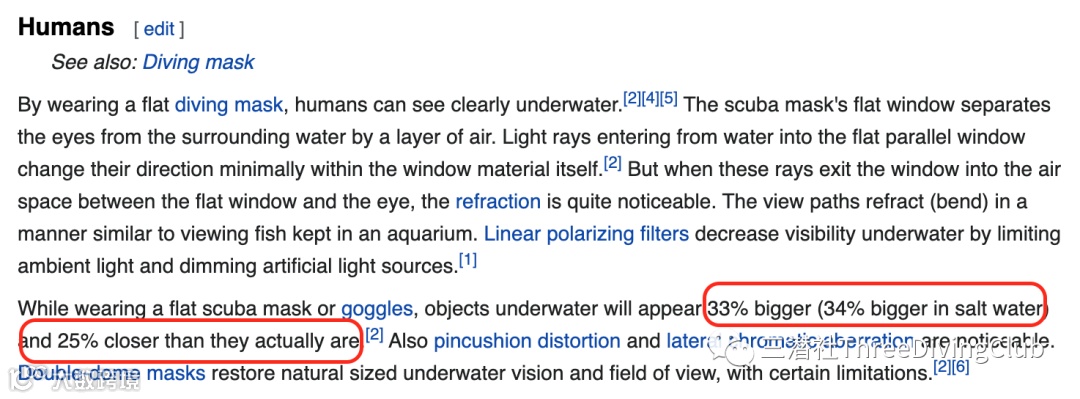上面截图截自《休闲潜水百科全书》,写到:“……在陆地上(空气中),只有远处的物体看起来才会模糊不清(漫射且对比不明显)。因此,人的大脑已经习惯了这个现象:亦即模糊不清的物体,就是在很远的地方。”“由于水也能产生慢射、色彩吸收和对比消失的效果,因此您的视觉系统会比照在陆地(空气中)的情况、来解读处于同样条件下的物体 - 就是在很远的地方。然而,水可以在很短的距离内就制造出这些效果,使某样物体看起来的距离比实际距离远。”