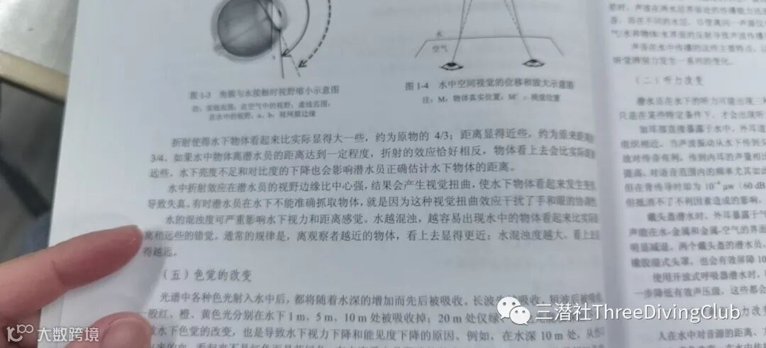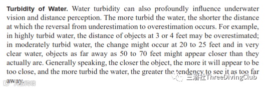 亦或《潜水医学》写到:水的浑浊度可严重影响水下视力和距离感觉。水越浑浊,越容易出现水中的物体看起来比实际距离稍远些的错觉。通常的规律是,离观察者越近的物体,看上去显得更近;水浑浊度越大,看上去显得越远。
