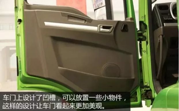 新M3000的驾驶室非常的简洁,但是也不失优雅,驾驶室门板上设计了几个凹槽和储物格,整个车门显得非常的漂亮。驾驶室采用的是三级蹬车梯,最下面的一级为软性连接,在恶劣环境下可以防止损坏,蹬车梯还有打孔防滑的设计,比较人性化。