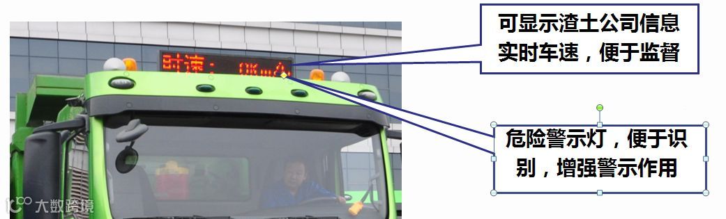 在驾驶室的上面有示廓灯和LED显示屏,可以将车辆的速度实时的显示在上面,非常直观。一左一右两个示廓灯可以在大雾、灰尘比较重的情况下展现车辆的外廓,避免发生事故。
