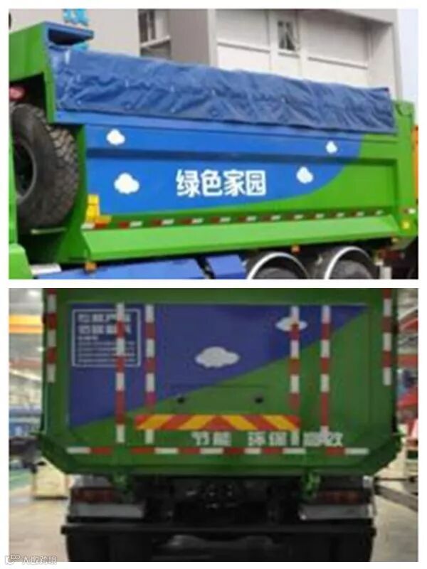 电动折叠式密闭篷布顶盖+后门板双密封结构。实现车厢全封闭、无抛洒,后门平面设计,减少积土附着,降低扬尘污染。