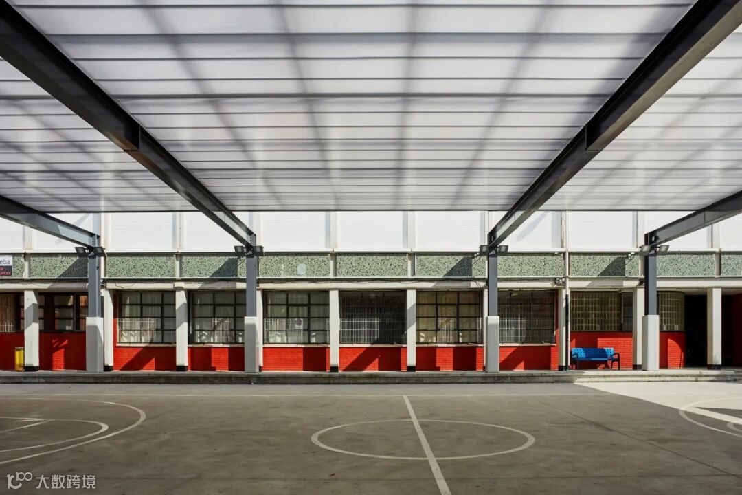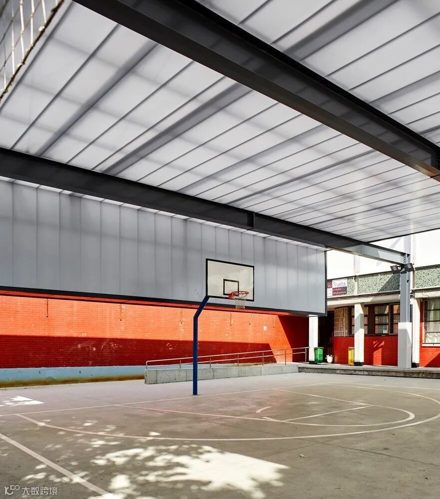 顶棚由两个面组成,第一个面为紧凑型聚碳酸酯,可以收集雨水而且有减噪的效果。位于下层的第二个面多孔聚碳酸酯精加工而成,能够抵御篮球的撞击。聚碳酸酯的透光性可以保持操场的亮度,而中空结构让热量留在了两层面之间,从而达到了遮阳效果。