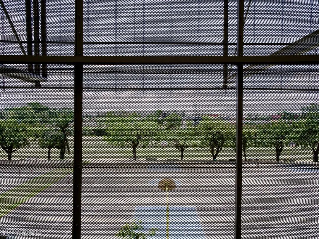 沿着体育馆一周叠加排布了鱼鳞一般的金属遮阳板,金属板上的洞不仅透光也通风。