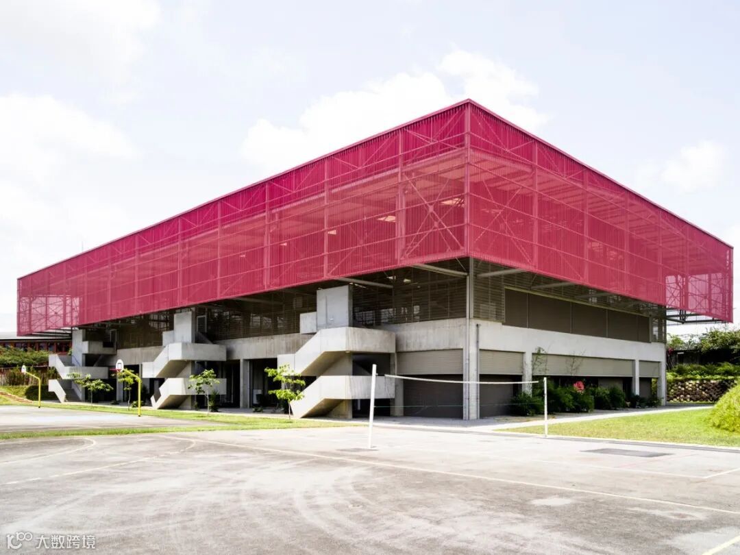 立面的外层还加有一层红色的垂直百叶金属板,这与里面的金属板有着同样的作用。当然,除此以外,红色更加容易让人感受到运动的激情。