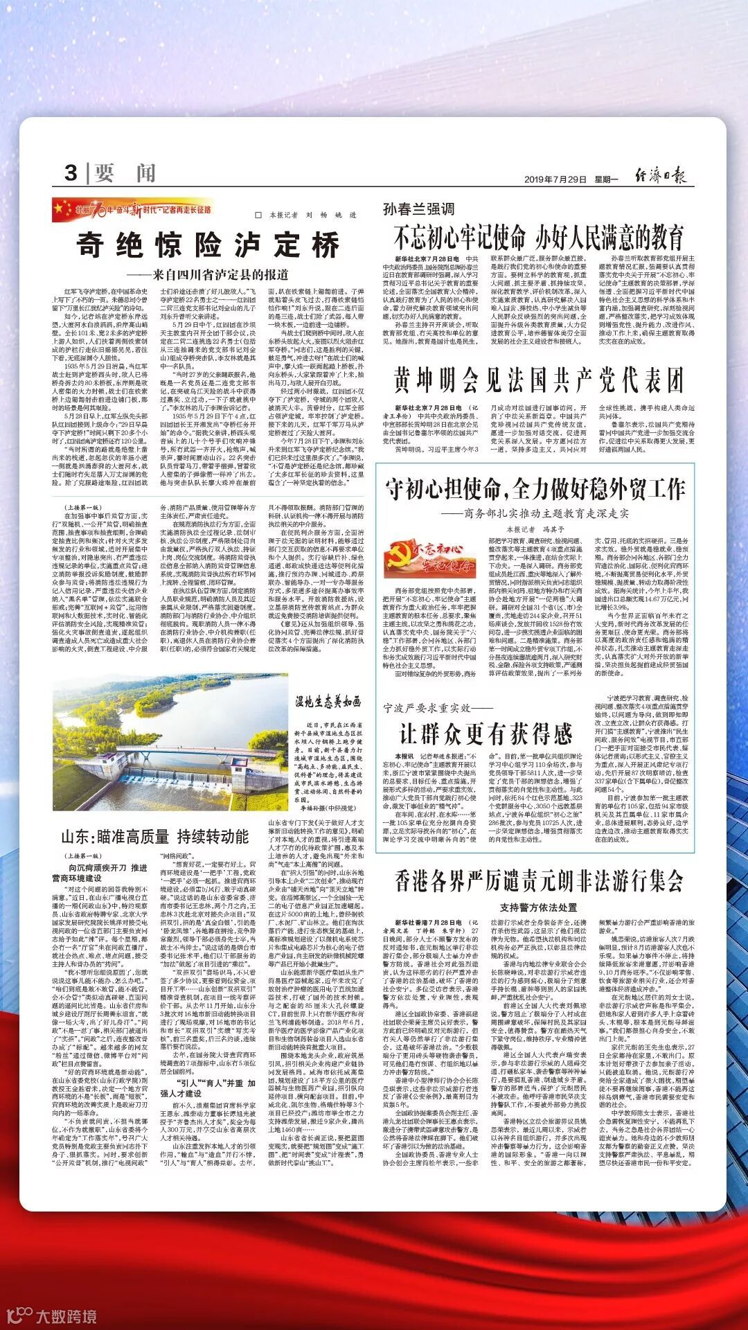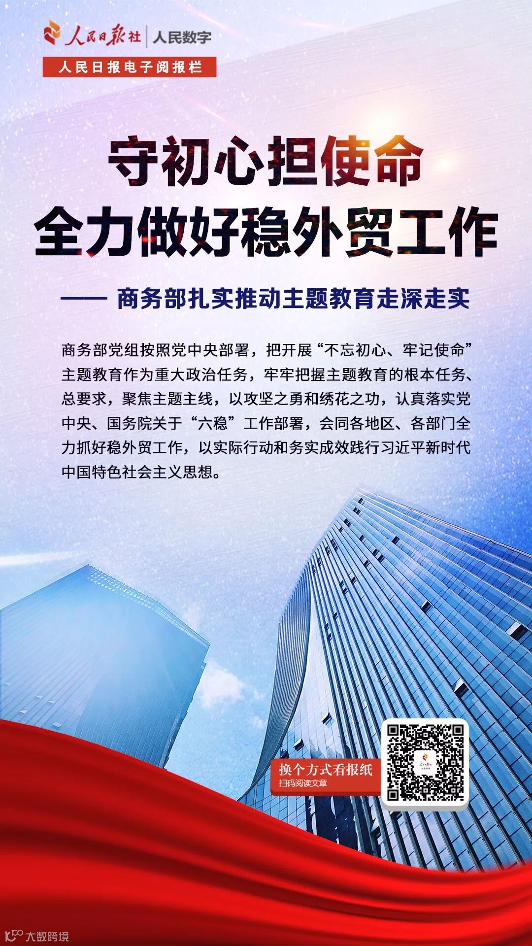 商务部党组按照党中央部署,把开展“不忘初心、牢记使命”主题教育作为重大政治任务,牢牢把握主题教育的根本任务、总要求,聚焦主题主线,以攻坚之勇和绣花之功,认真落实党中央、国务院关于“六稳”工作部署,会同各地区、各部门全力抓好稳外贸工作,以实际行动和务实成效践行习近平新时代中国特色社会主义思想。