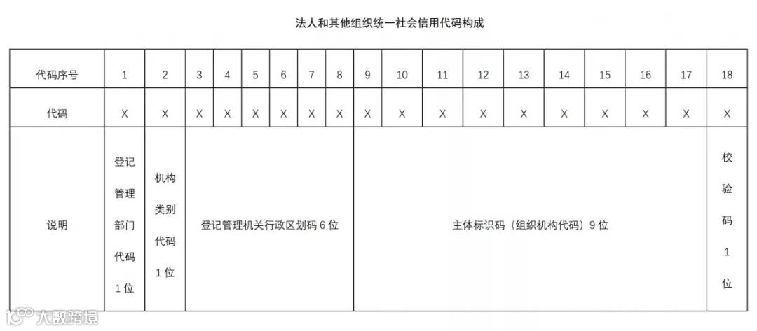 法人和其他组织统一社会信用代码,是每一个法人和其他组织在全国范围内唯一的、终身不变的法定身份识别码。统一社会信用代码由国家标准委依据《国务院关于批转发展改革委等部门法人和其他组织统一社会信用代码制度建设总体方案的通知》(国发〔2015〕33号)文件规定,依据《法人和其他组织统一社会信用代码编制规则》(GB32100-2015)赋予的法人和其他组织的身份识别码,共18位,由五部分构成,其中:登记管理部门代码1位,机构类别代码1位,登记管理机关行政区划码6位,主体标识码(组织机构代码)9位,校验码1位。