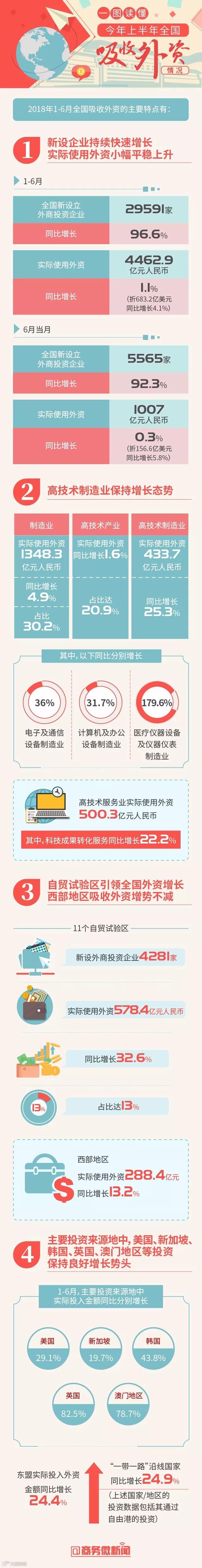 一图读懂 | 2018年上半年全国吸收外资情况出炉