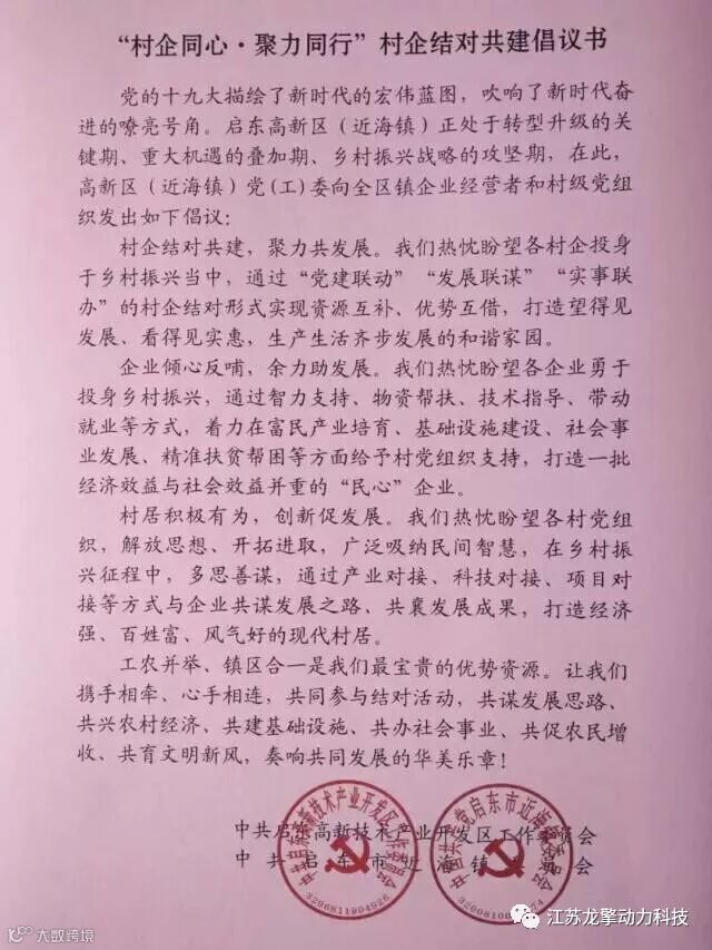 村企同心,聚力同行,共建共享,互惠双赢。村企结对共建,扬帆起航!