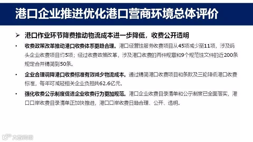 该报告有五大看点:一、港口口岸相关主体及进出口主要环节与流程;二、港口企业推进优化港口营商环境情况;三、我国港口进出口环节收费及国内外收费对比情况;四、港口企业推进优化港口营商环境总体评价;五、关于进一步优化港口营商环境的若干建议。