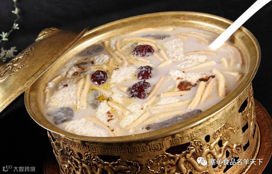 贵宾时摆设。将整羊加工后摆在长方形的大木盘里,象一只卧着的活羊,肉味鲜美,香飘满堂,浓郁扑鼻。宾客在进餐前,还要举行仪式,高唱赞歌,朗诵献整羊的祝辞等。据文献记载,成吉思汗曾设过全羊宴。忽必烈登基时,也设全羊宴祭神抵、待宾客。到了清代,全羊宴更加盛行,北京罗王府和内蒙古各盟旗王府中,都以全羊宴接待来宾。