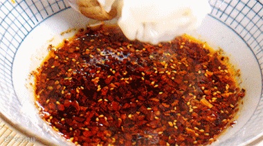 5.汤锅中的水再次烧沸后,放入馄饨,馄饨皮变得透明柔软即可出锅,稍稍沥干水分,盛在酸辣汁中,根据自己口味淋入适量油辣椒即可。