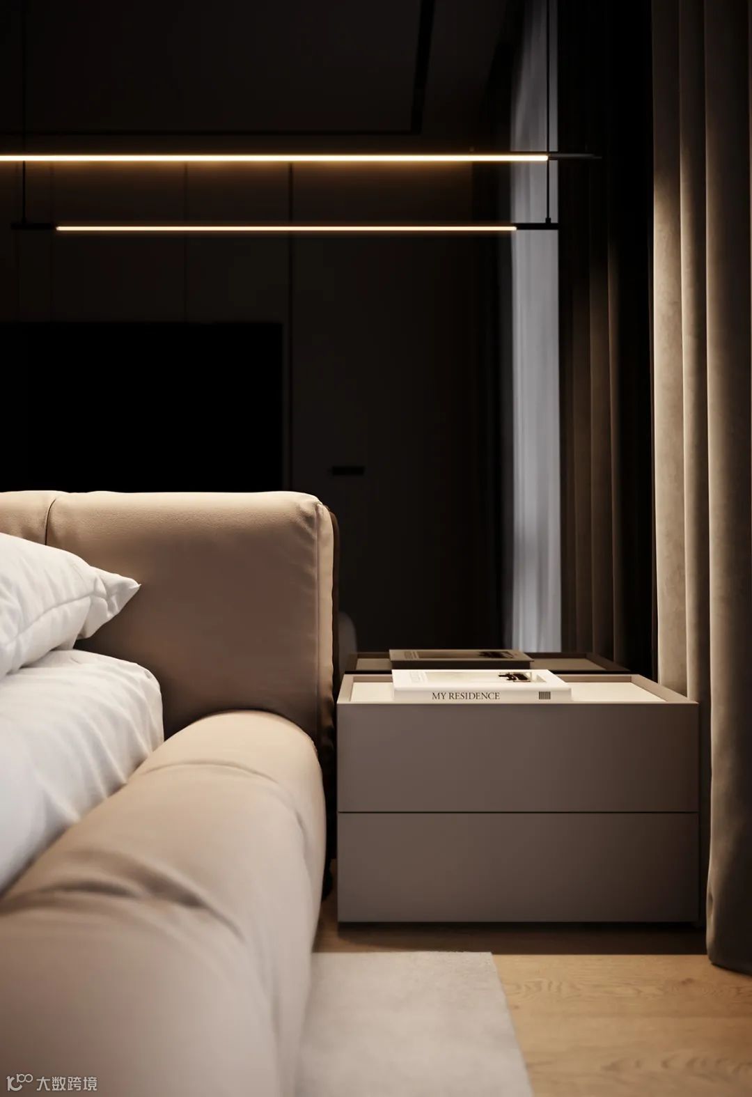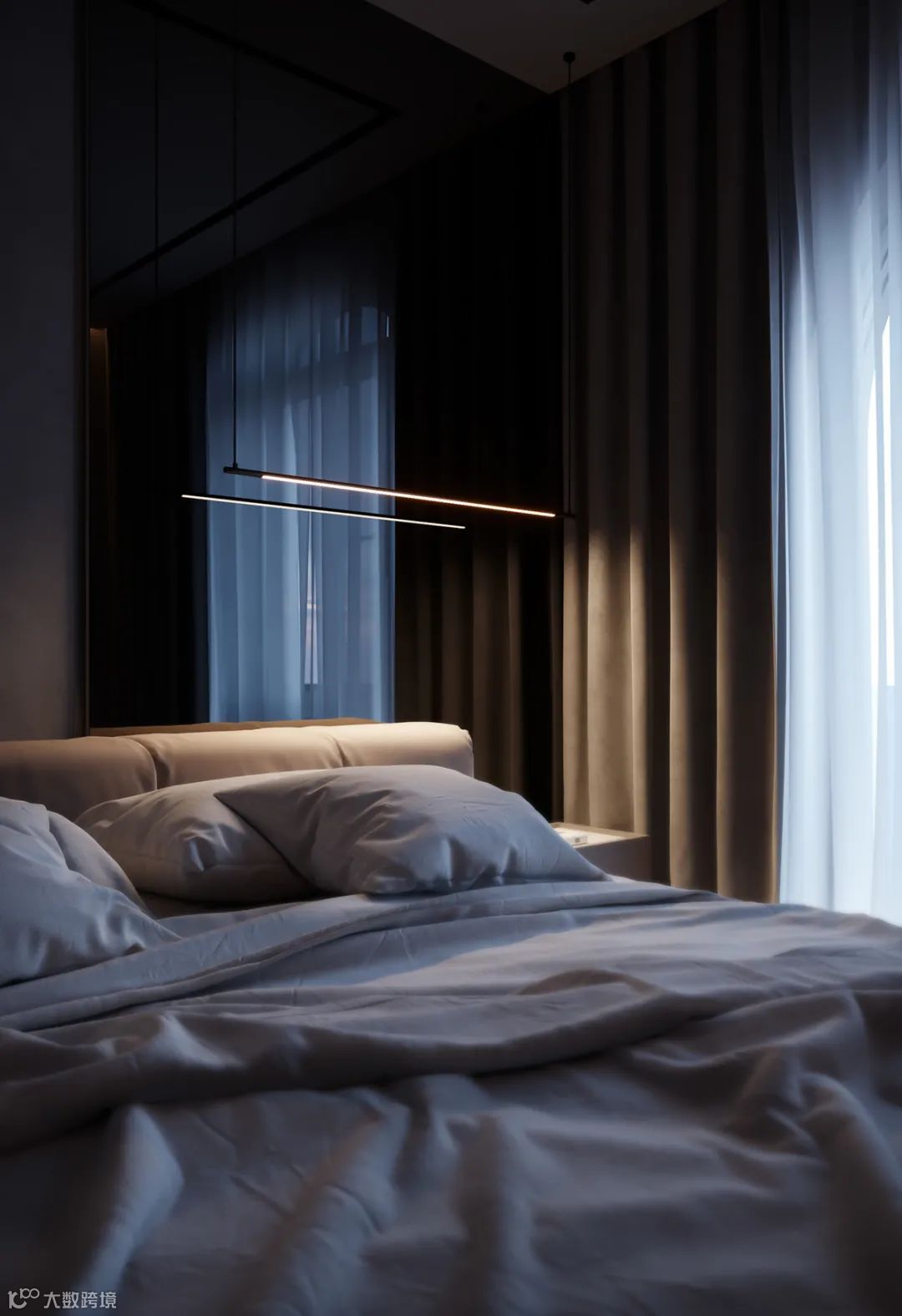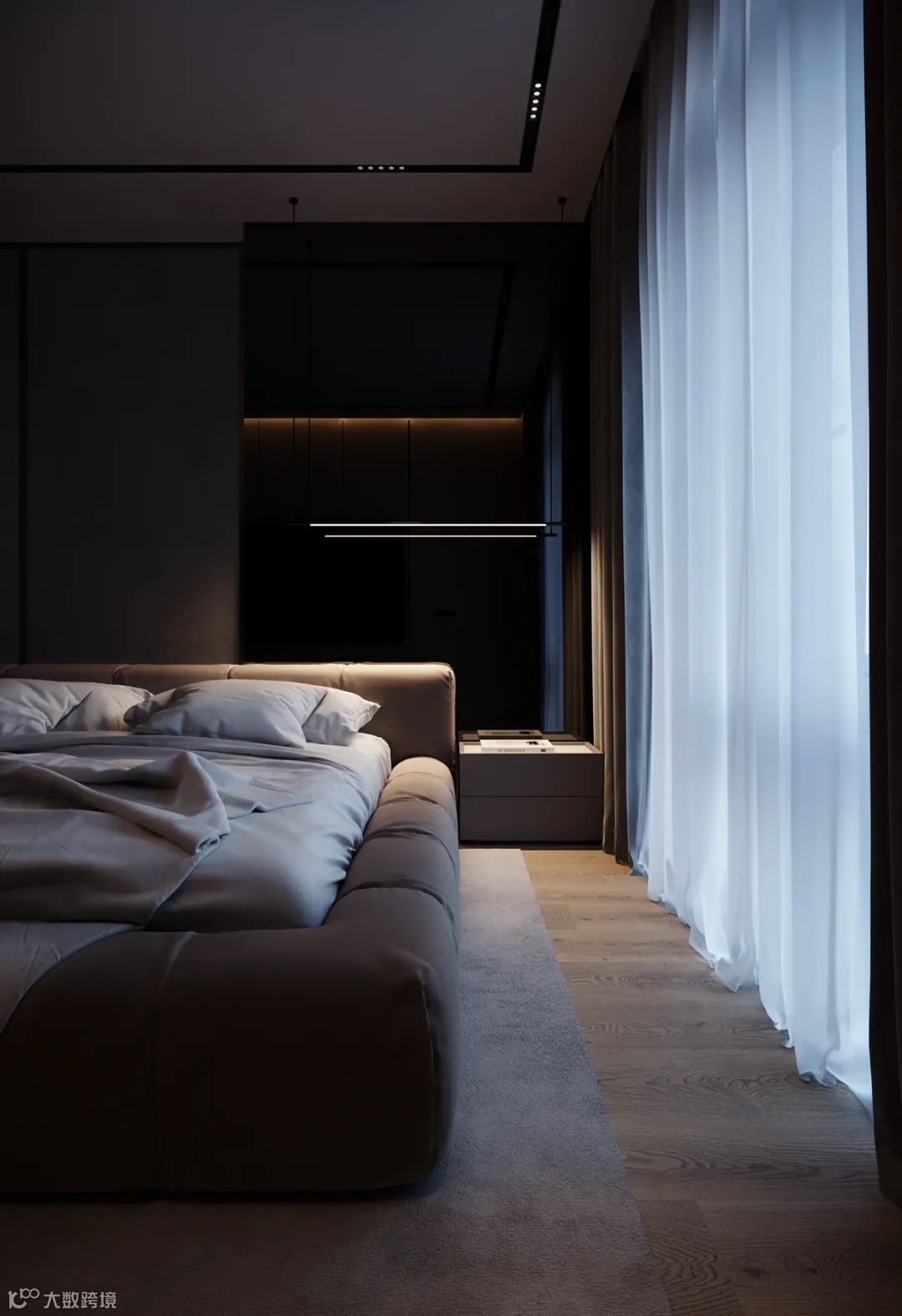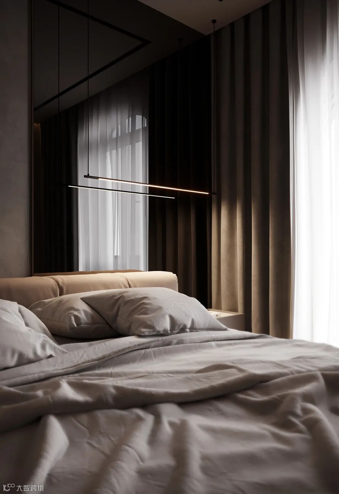 卧室以高级灰为主色调,利用自然光和室内人造光线的结合,营造出温馨宁静的感觉。