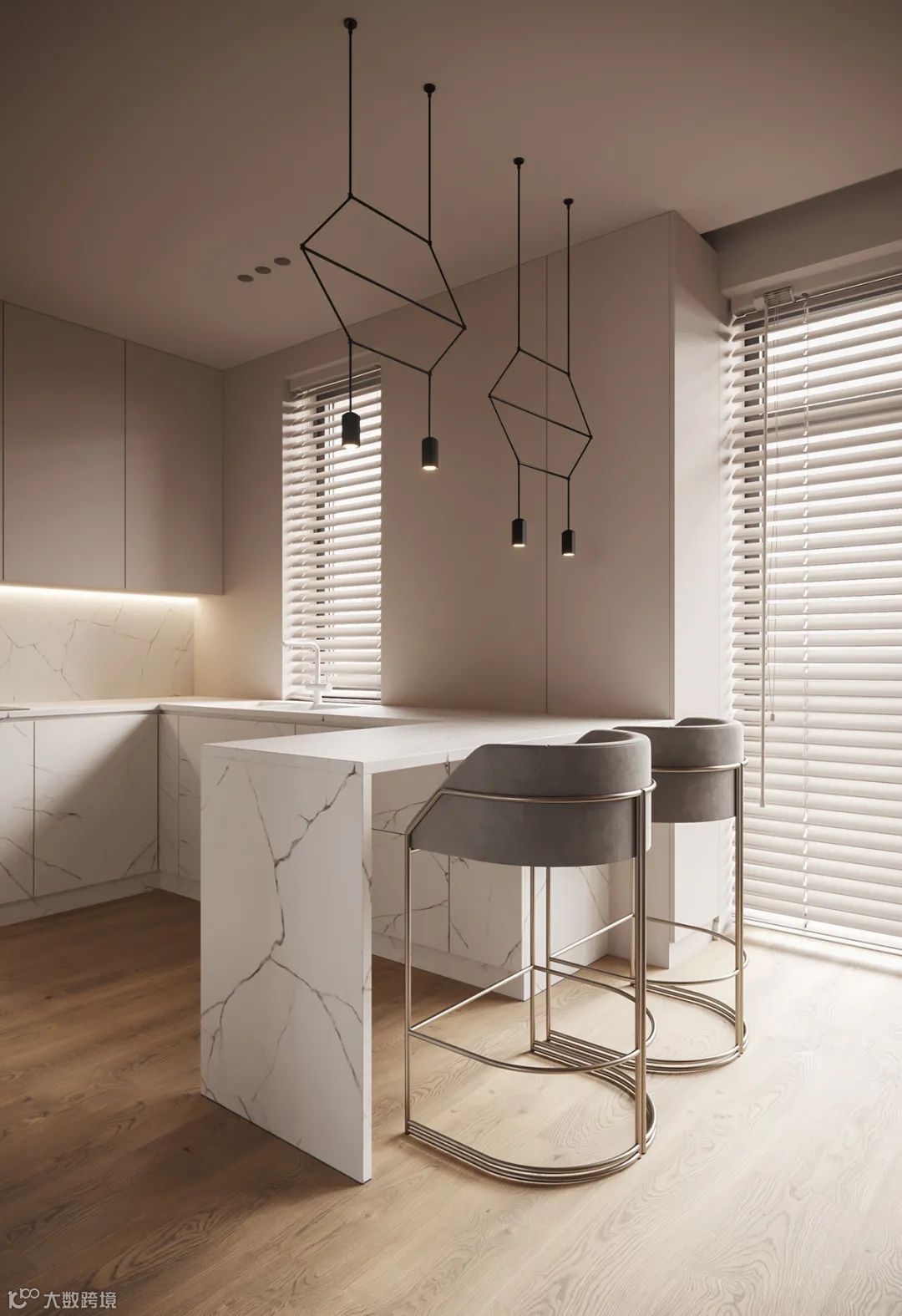 餐厨一体的开放式的布局让设计多了更多选择,整体的视觉感得到了伸展的效果,也让空间看起来更通透明亮。