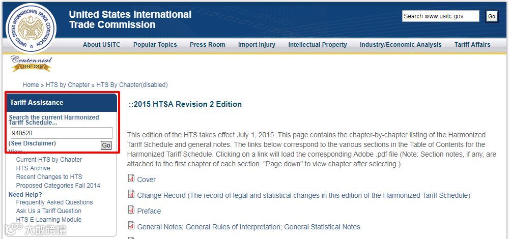 1. 查询HTS CODE:进入上述网站,在Tariff Assistance项下Search the current Harmonized Tariff Schedule...下的搜索框中输入输入中国HS CODE的前六位数,如台灯940520****,搜索结果页面的左边框有详细的HTS CODE,根据自己的产品选择HTS CODE。