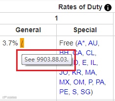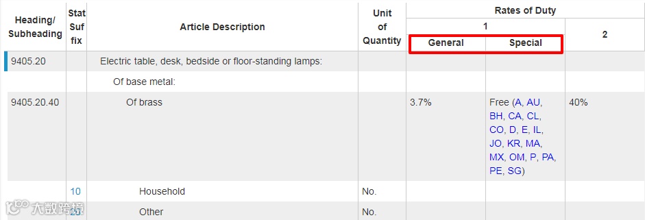 搜索页面中Rates of Duty,左边一栏“General”为一般进口税率,右边一栏“Special”是美国对特定国家征收的进口税率。我们看一般进口税率即可。