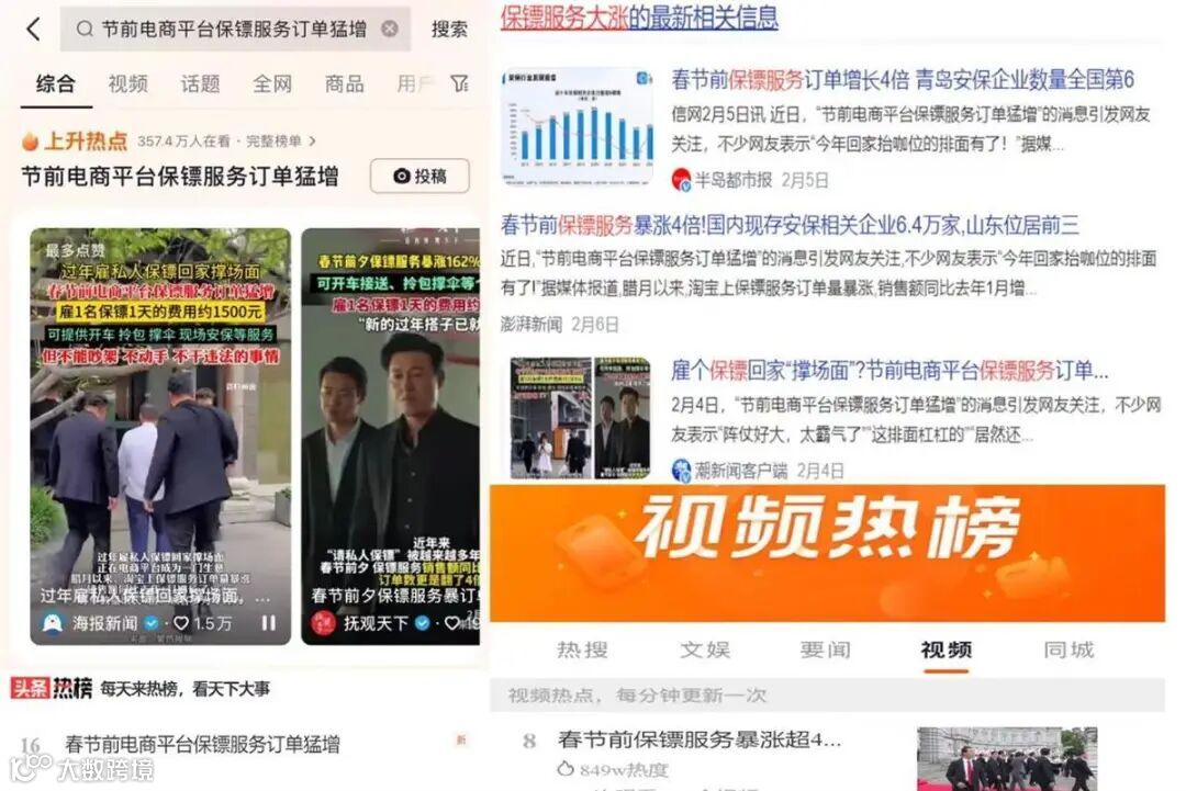 今年春节,私人保镖服务消费大涨,引发网友关注。相关话题,先后登上今日头条热榜、抖音热榜、微博热搜等榜单。