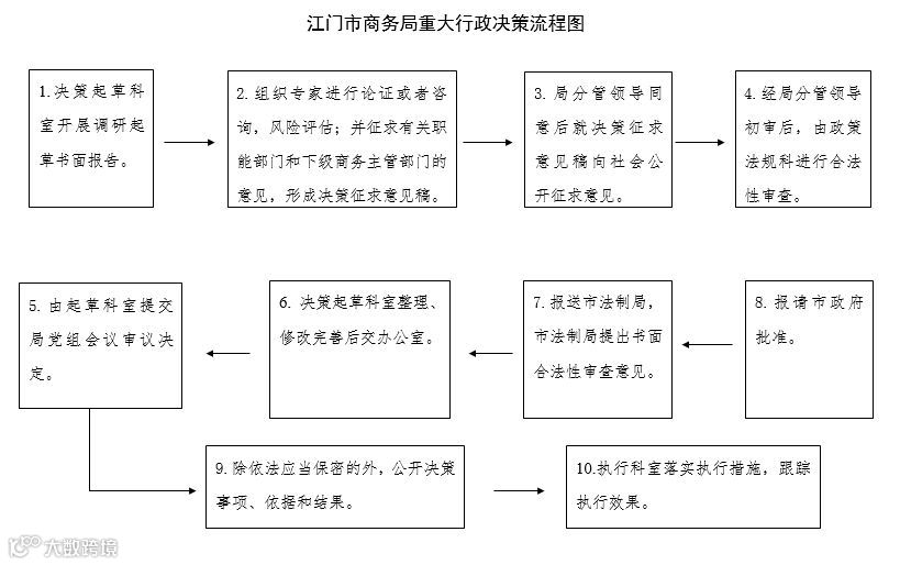 为推进商务行政决策的科学化、民主化、法制化,根据《江门市人民政府关于印发江门市人民政府重大行政决策程序规定(试行)的通知》(江府〔2014〕10号)的要求,市商务局制定《江门市商务局重大行政决策程序规定(试行)》(详见市商务局网站,以下简称商务决策规定)。