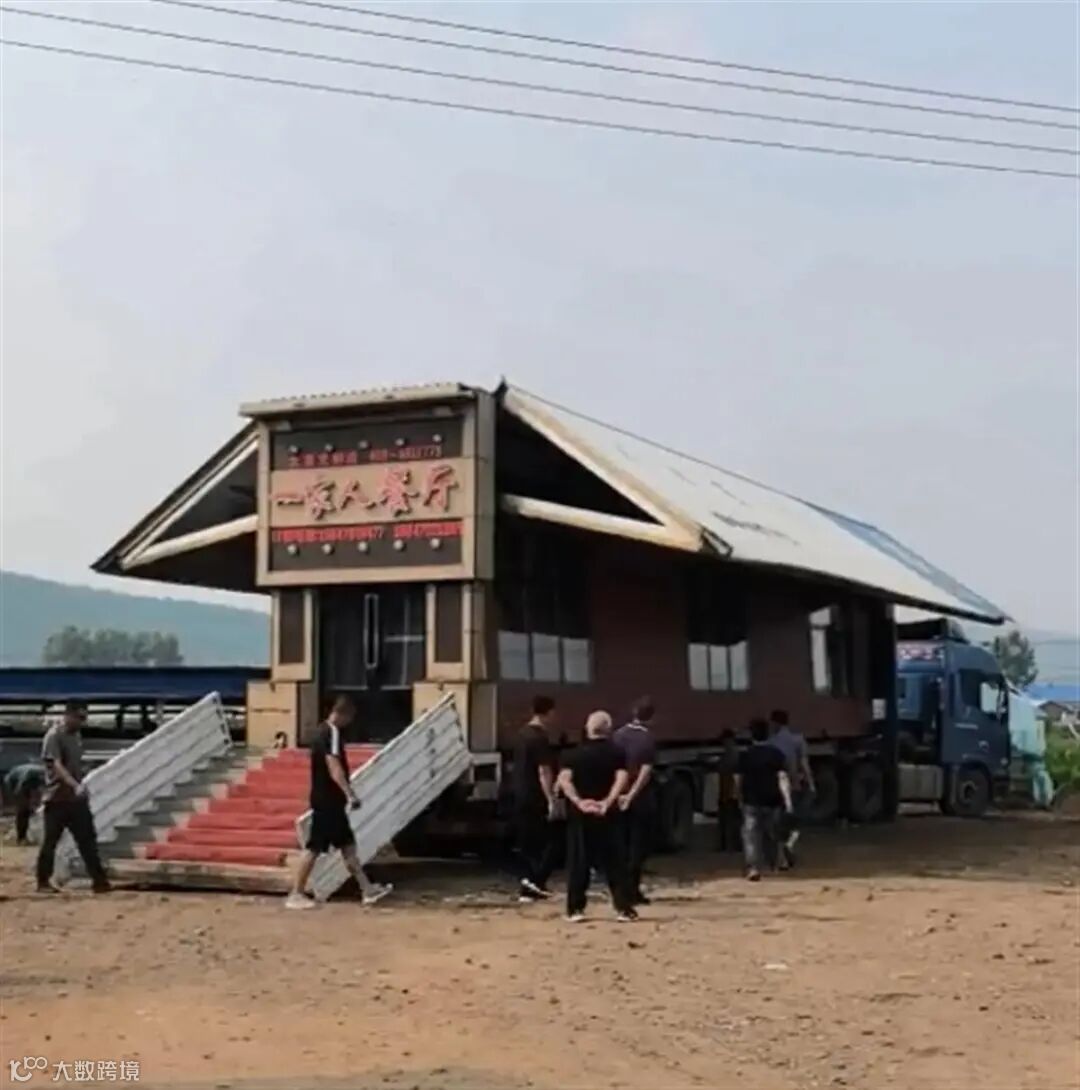 现场视频显示,一块空地上停着一辆厢式大货车,随后它开始“变形”:集装箱后门打开形成一个步梯,露出一餐厅的招牌;然后集装箱两侧继续展开,形成房子的屋顶;几分钟内,货车在空地上变成一座酒楼。视频发布者配文表示:“变形金刚宴会车版。”