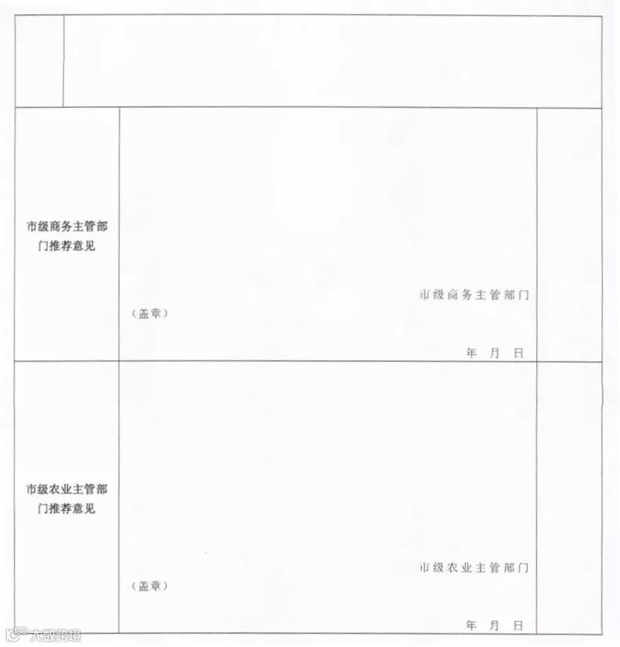 3、各地级以上市商务主管部门联合农业主管部门审核推荐,在企业申报材料上盖章后,于10月31日前将申报材料分别报送省商务厅(一份)、省农业厅(两份),每市推荐名额不超过2个。