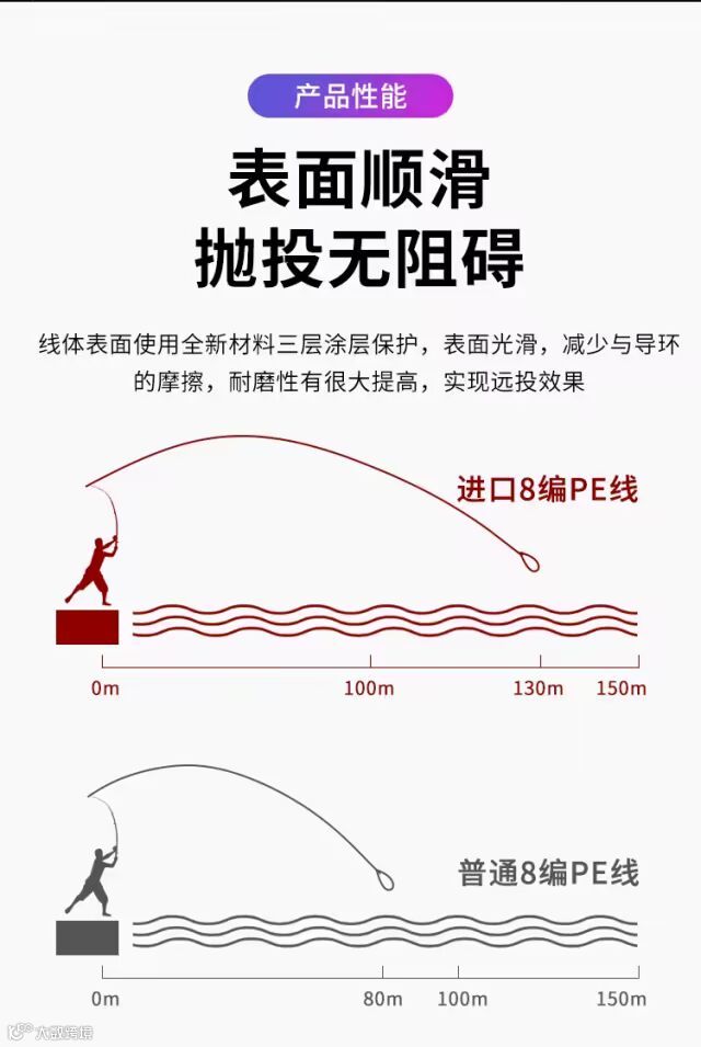 编织型PE线的出现将线径和拉力值提升到了一个前所未有的高度,更细的线径,更强的拉力值,能让饵抛投更远的距离,无延展的特性令远距离的触感和传导穿刺成为可能。
