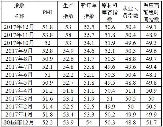2016年12月—2017年12月广东省制造业PMI主要分项指数值表