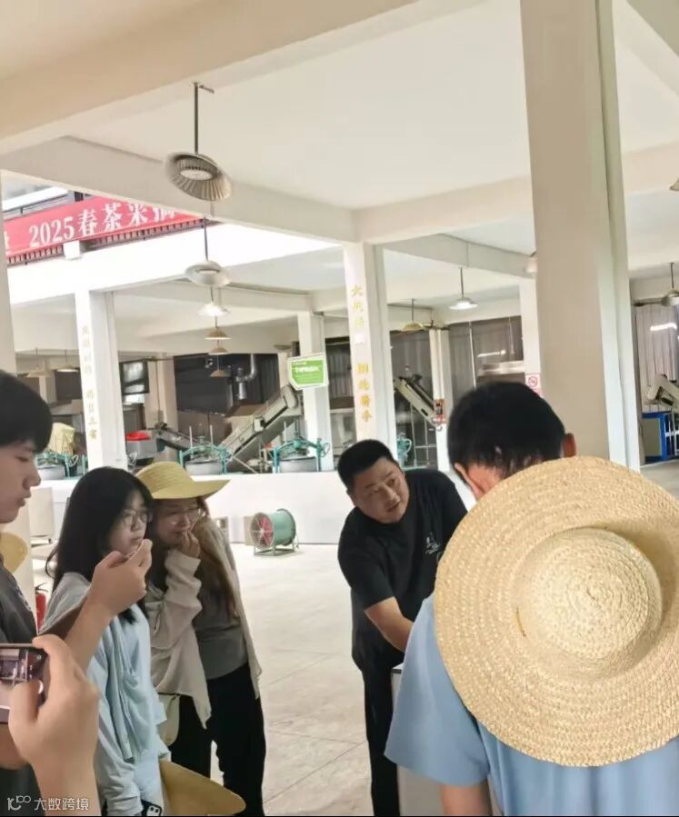 在金苔香生产车间,同学们化身“学徒”,跟随制茶师傅参观制茶车间,了解恩施玉露的核心工艺。