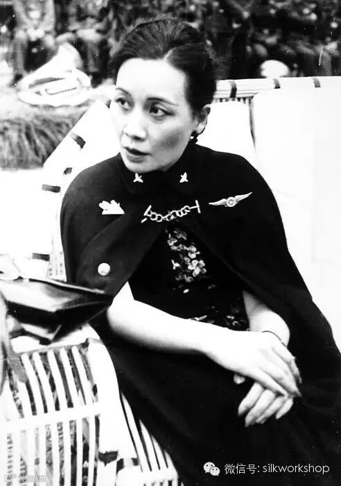 宋美龄的旗袍经常会配上翡翠、珍珠、玛瑙的扣子,或者她会搭配这些材质的珠链。但最著名的配饰,还是她胸前的这枚胸针——当时中国空军的徽章。会见美国客人时经常佩带这枚胸针。众所周知,