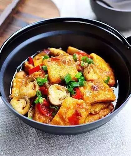 8、加入煎好的豆腐,清水250ml,生抽,砂糖,鸡精,白胡椒粉,大火煮开后移入干锅;或是转小火煮至汤汁浓稠即可盛盘。