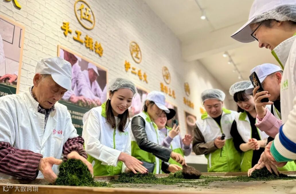 金苔香制茶车间,王忠德现场教学制作恩施玉露。王师傅的关门弟子,同时也是金苔香联合创始人之一金岁宏,现场为大家讲解整个茶叶无落地生产。