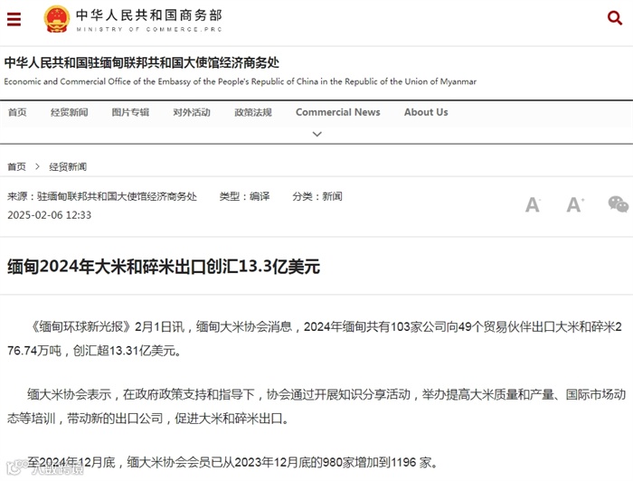 全球动态 | 缅甸2024年大米和碎米出口创汇13.3亿美元