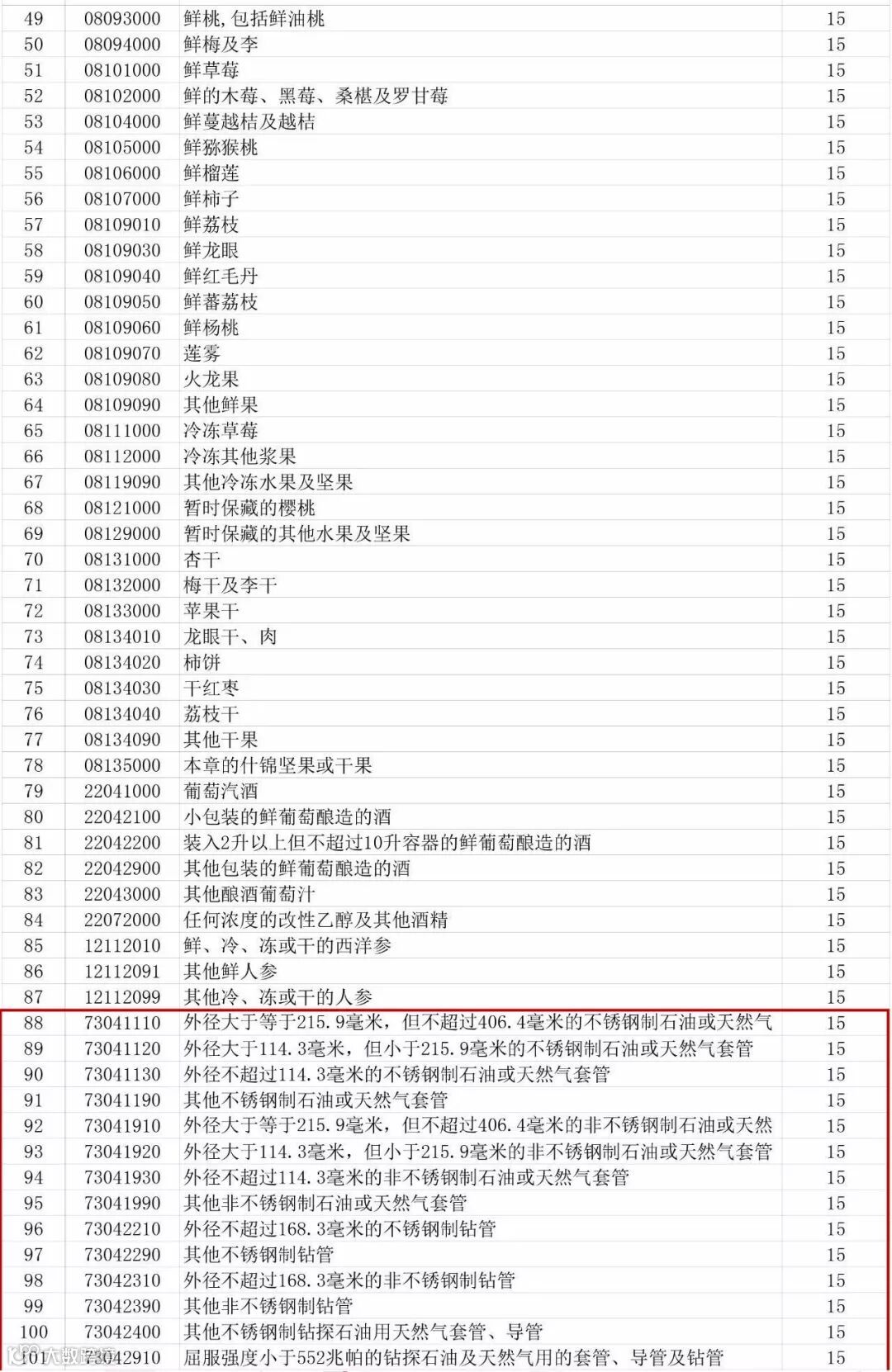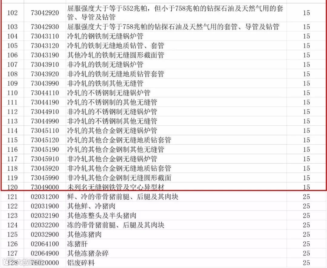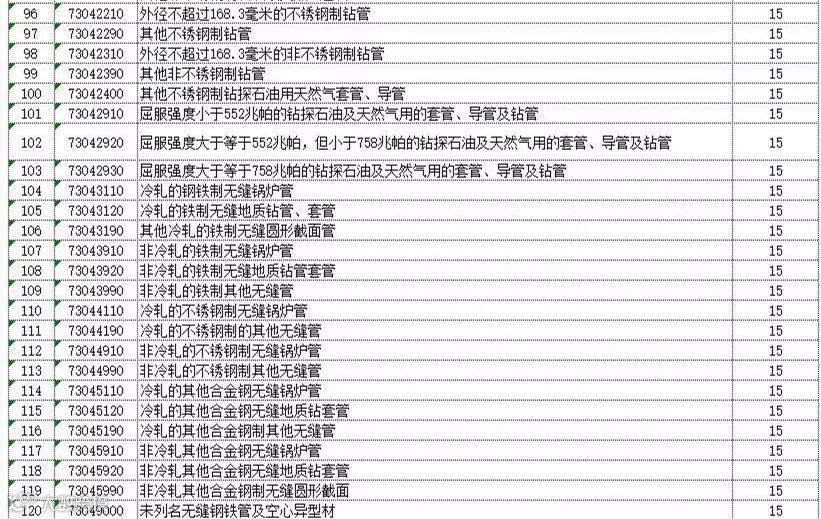 经国务院批准,国务院关税税则委员会决定自2018年4月2日起,对原产于美国的7类128项进口商品中止关税减让义务,在现行适用关税税率基础上加征关税。其中,外径大于等于215.9毫米,但不超过406.4毫米的不锈钢制石油或天然气套管;冷轧的钢铁制无缝锅炉管等钢管产品加征15%的关税税率。