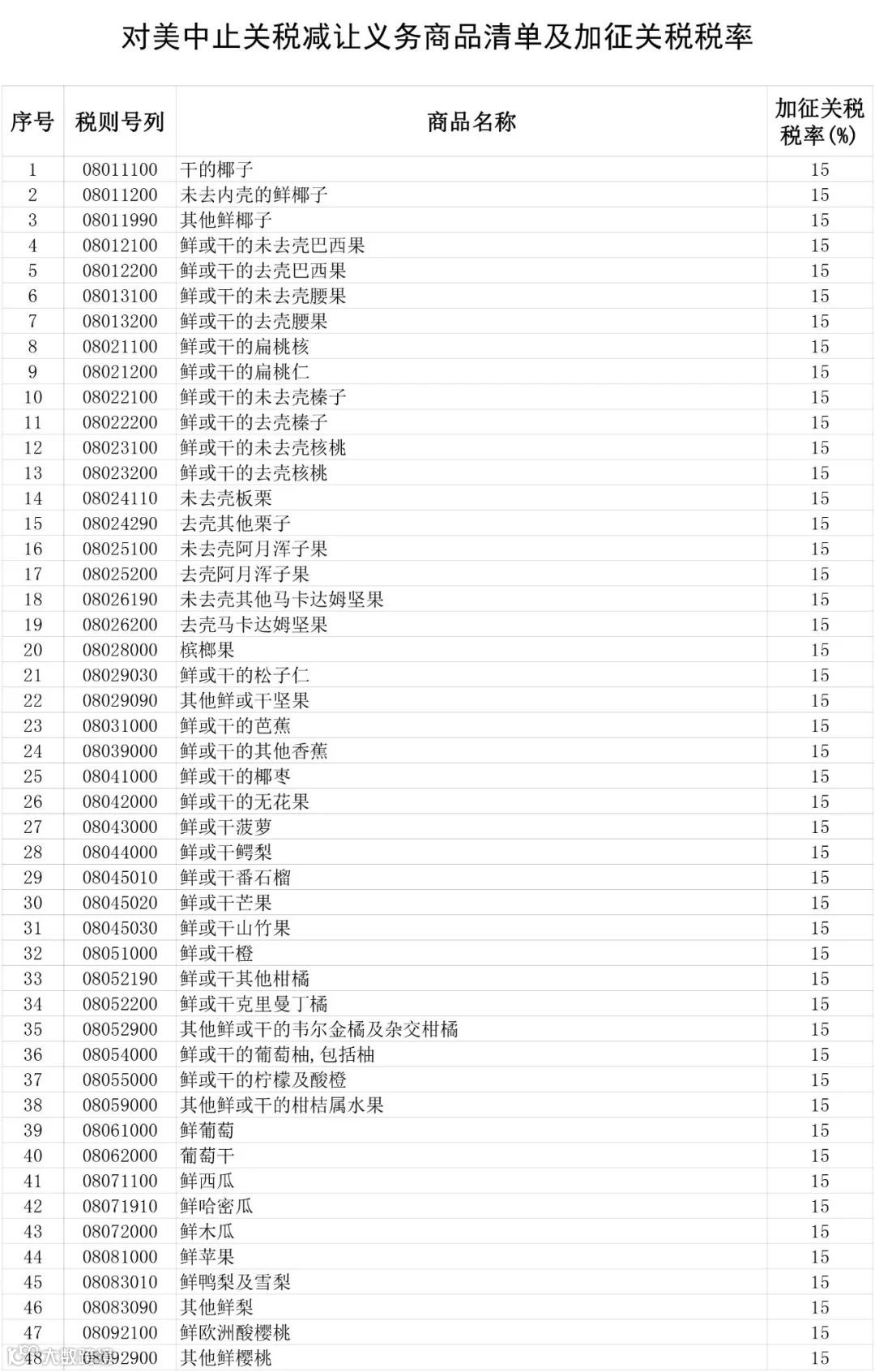 通知明确,我国自2018年4月2日起对原产于美国的7类128项进口商品中止关税减让义务,在现行适用关税税率基础上加征关税,对水果及制品等120项进口商品加征关税税率为15%,对猪肉及制品等8项进口商品加征关税税率为25%。现行保税、减免税政策不变。