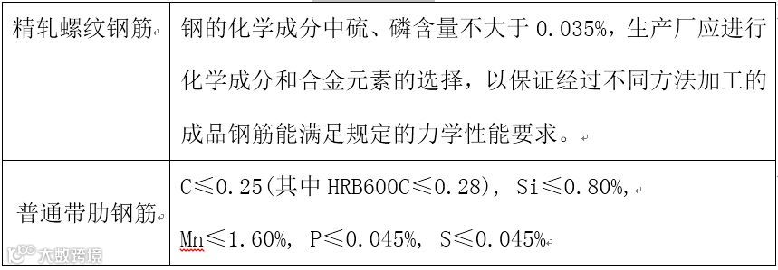 可以看出,精轧螺纹钢的强度远大于普通螺纹钢,且不再注重化学成分的吻合,而是要满足规定的力学性能。
