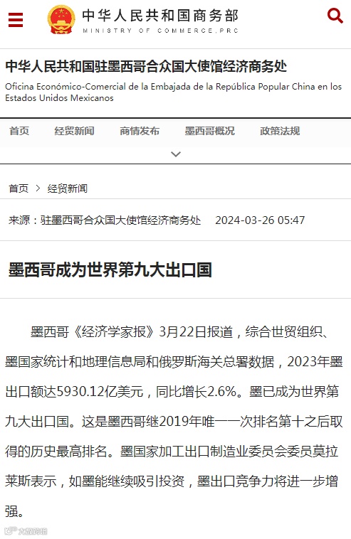 墨西哥《经济学家报》3月22日报道,综合世贸组织、墨国家统计和地理信息局和俄罗斯海关总署数据,2023年墨出口额达5930.12亿美元,同比增长2.6%。墨已成为世界第九大出口国。这是墨西哥继2019年唯一一次排名第十之后取得的历史最高排名。墨国家加工出口制造业委员会委员莫拉莱斯表示,如墨能继续吸引投资,墨出口竞争力将进一步增强。
