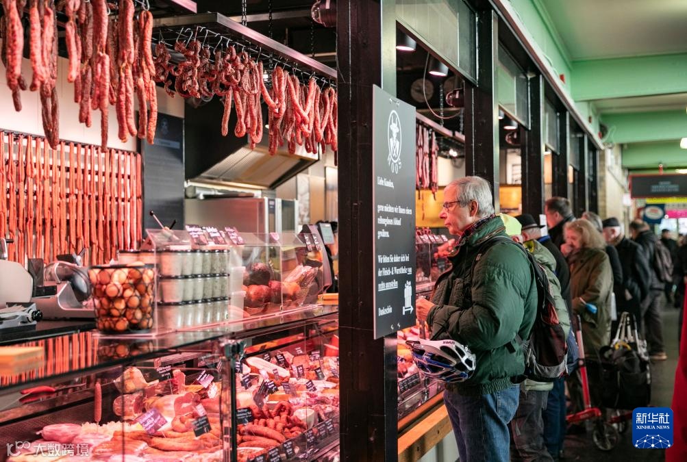 12月20日,人们在德国法兰克福“小市场大厅”排队购买肉制品。“小市场大厅”始建于19世纪末,是法兰克福市中心著名的农副产品零售大厅。新华社记者 张帆 摄